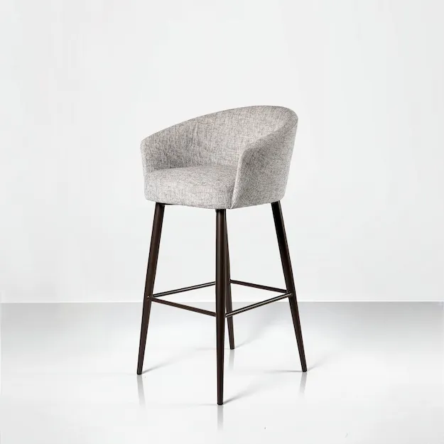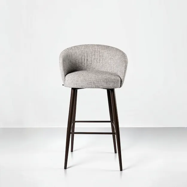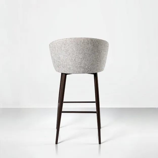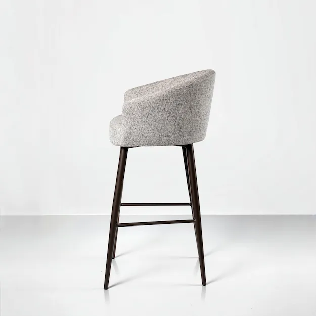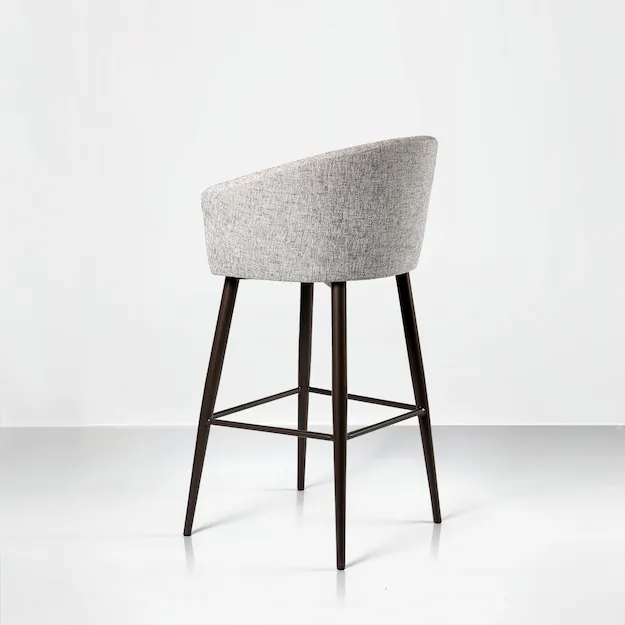 This modern bar stool features a curved, wraparound backrest that provides both comfort and elegant support. Upholstered in a textured, light grey fabric, the seat offers a soft, refined look that complements a wide range of interiors. The stool stands on sleek, tapered stainless steel legs. Its contemporary silhouette, sturdy construction, and inviting design make it an ideal choice for kitchen islands, high tables, and hospitality spaces seeking a balance of style and functionality.