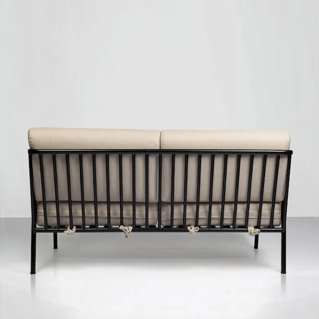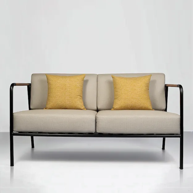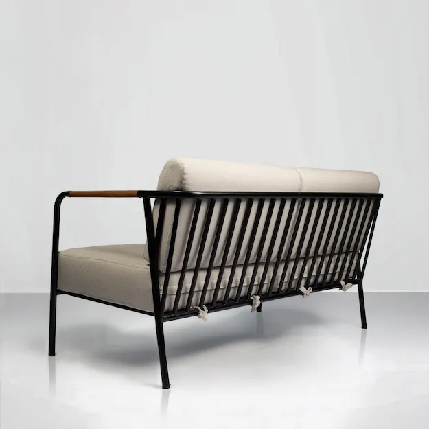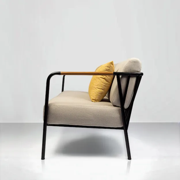 A spacious outdoor sofa crafted in powder-coated metal with wooden armrests, combining comfort, style, and practicality for modern outdoor living.
